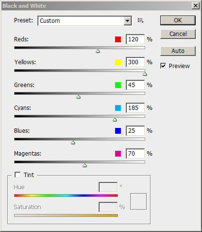 Duplicate the background layer once, then hit Ctrl+Alt+Shift+B to bring up the the Black and White image adjustment tool, apply the following settings on the duplicated layer: