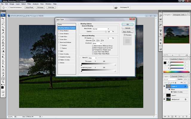 Create a new layer, fill it with any color you want, double click on the layer to open the layer styles, choose pattern overlay, the rain you created should be the last on the list. I used soft light for the blend mode, and changed the opacity to 60%. Then go back to the blending options change the fill opacity to 0%.
